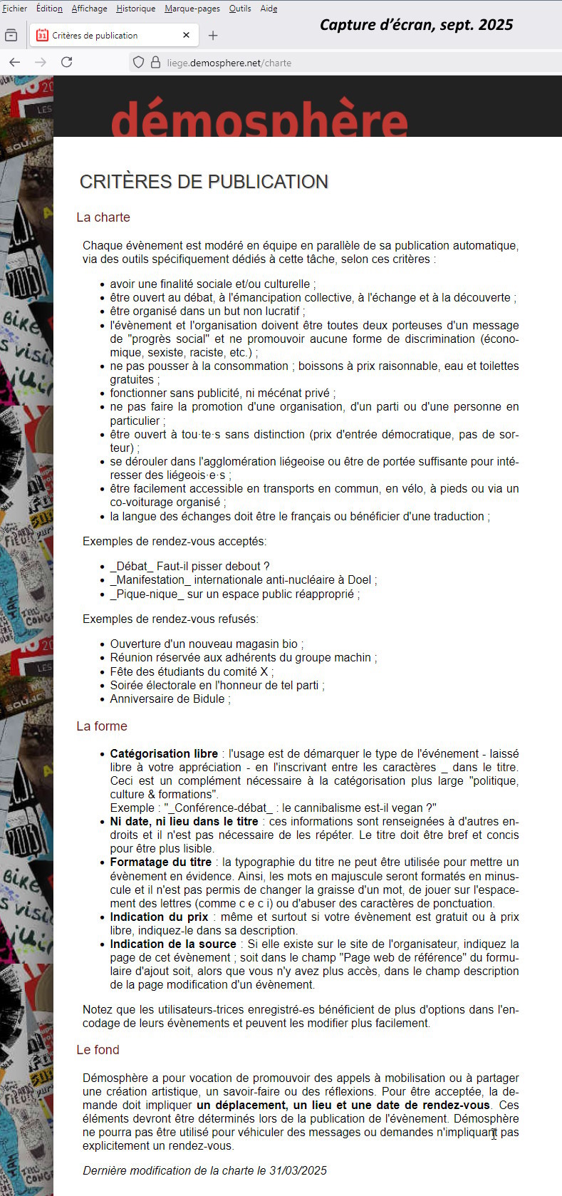 - En ce mois d’août 2025, Liège-Démosphère n’a pas agréé l’annonce de notre conférence du 26 septembre, sans même nous en avertir, du moins dans l’immédiat : finalement, 2 ou trois semaines plus tard, nous avons reçu un courriel justifiant la décision comme précédemment, pour cause de critères de publication non rencontrés. Toutefois, dans un post-scriptum, un membre (« Alex », sans plus) de l’« équipe Démosphère Liège » révèle les dessous de l’affaire. Extraits de ce courriel dont il n’est pas nécessaire de commenter la pauvreté intellectuelle et morale :